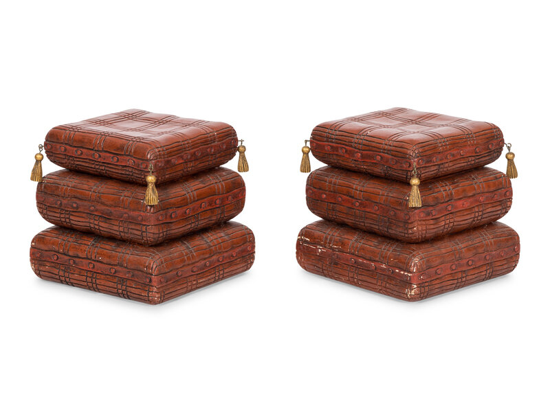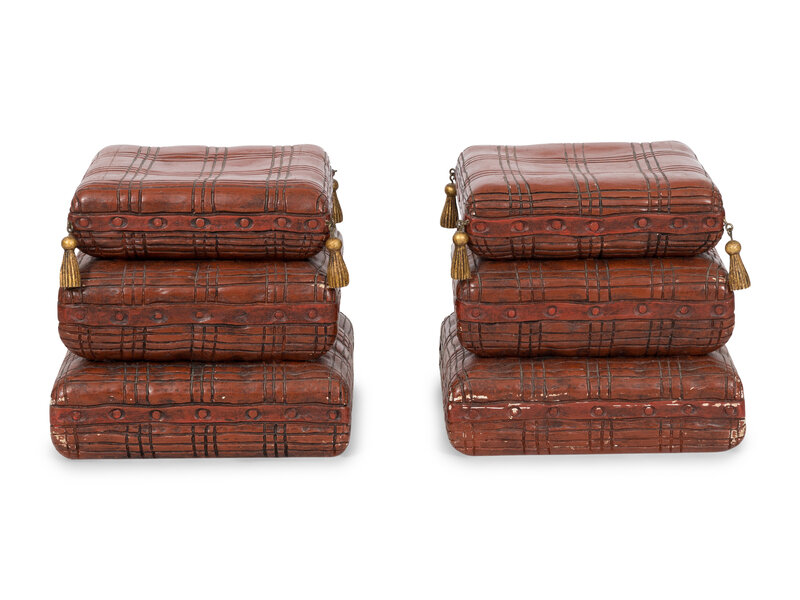 A Pair of Italian Red-Painted Carved Wood Stacked Cushion-Form Stools