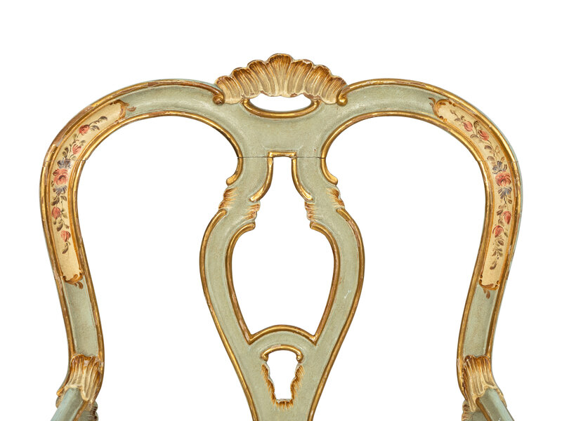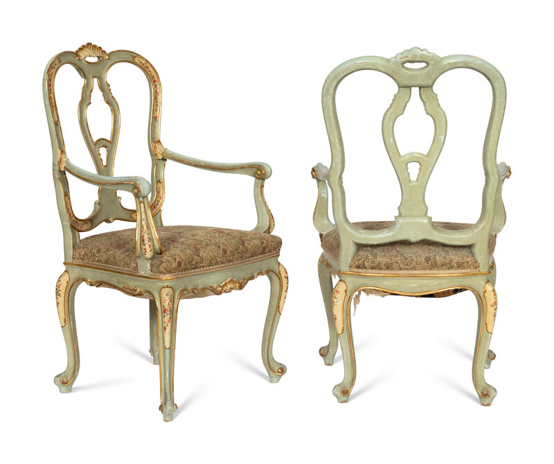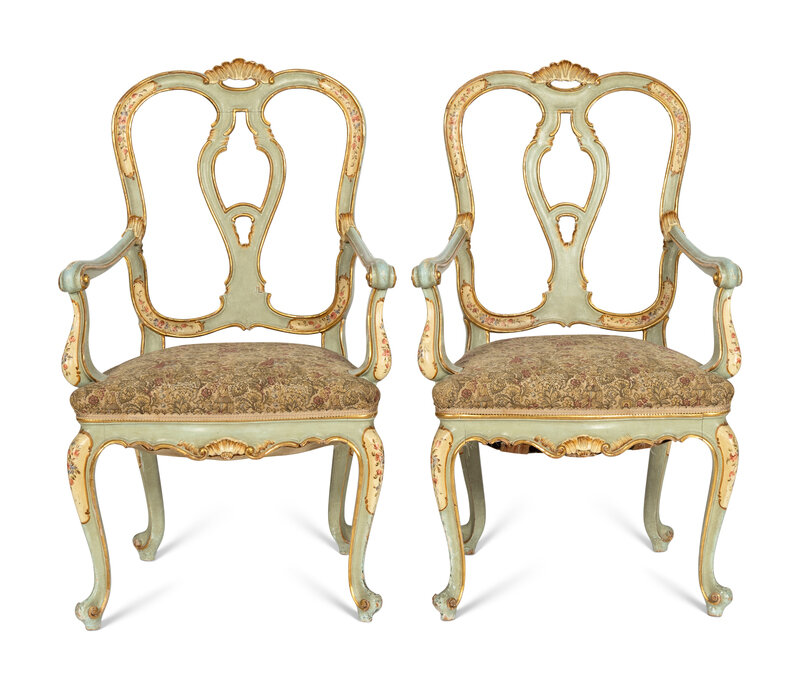 A Pair of Italian Rococo Style Painted and Parcel Gilt Armchairs