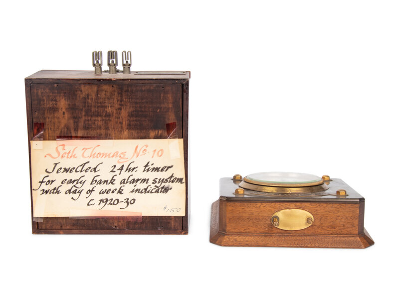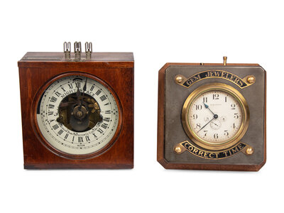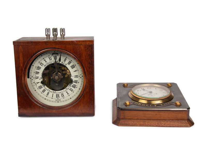 An American Bank Protection Co. Electric Time Clock and a Waltham Correct Time Wall Clock