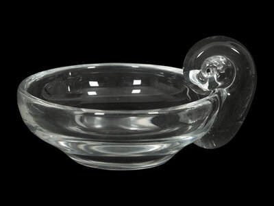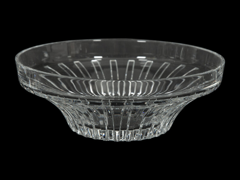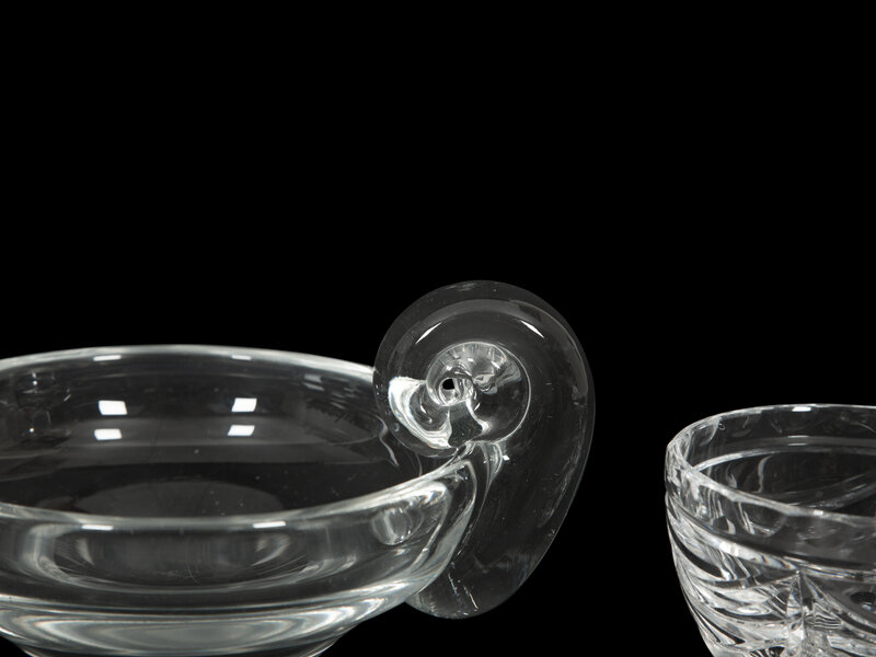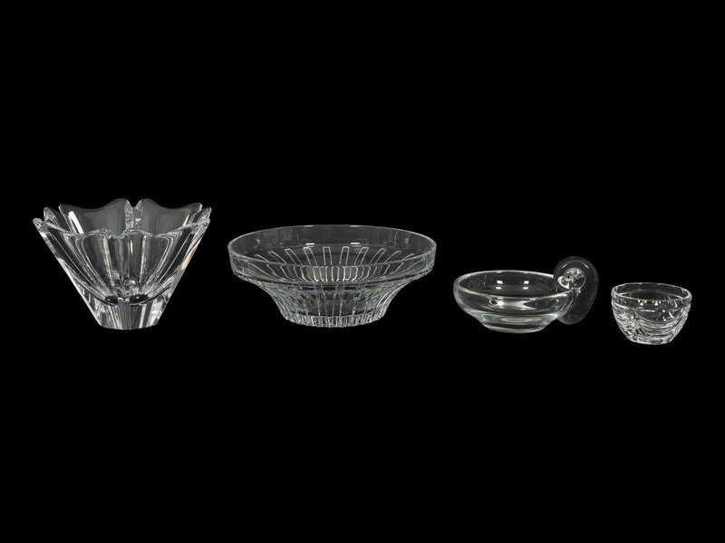comprising a Baccarat Gentiane fruit bowl, an Orrefors Orion bowl, a Steuben ashtray with scroll handle, and a Royal Doulton mini bowl.