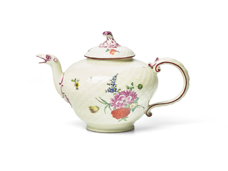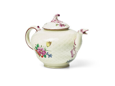 the body and lid decorated with hand-painted flowers, with serpent-form spout, marked with crowned interlaced c's in underglaze blue and impressed numerals, "640," to underside, the teapot and lid also bearing old accession number respectively, "1970.25.A" and "1970.25.B."