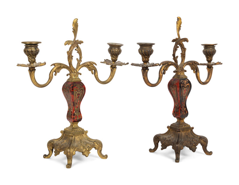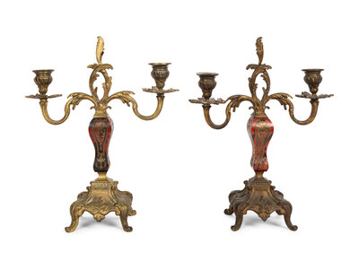A Pair of French Gilt Bronze Mounted Boulle Marquetry Two-Light Candelabra