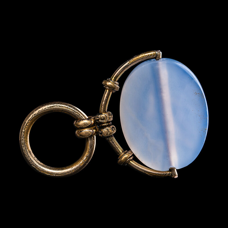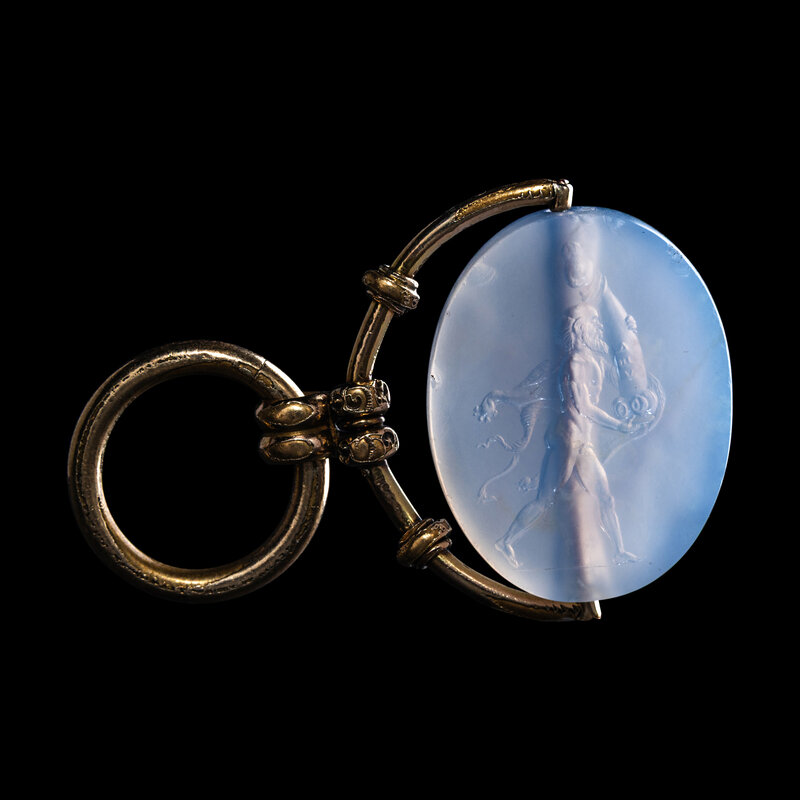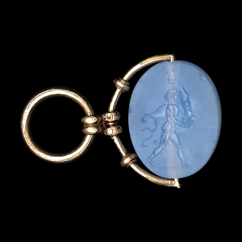 A Greek Blue Chalcedony Intaglio with a Satyr Holding a Herm