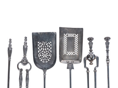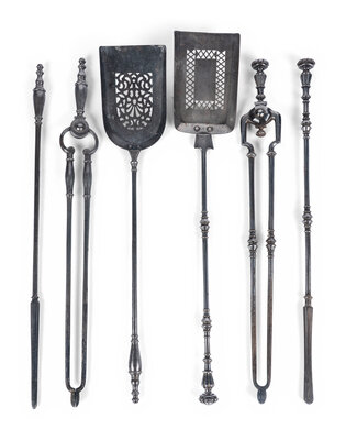 comprising a brass fire fender and six cast iron fireplace tools; 7 items total.