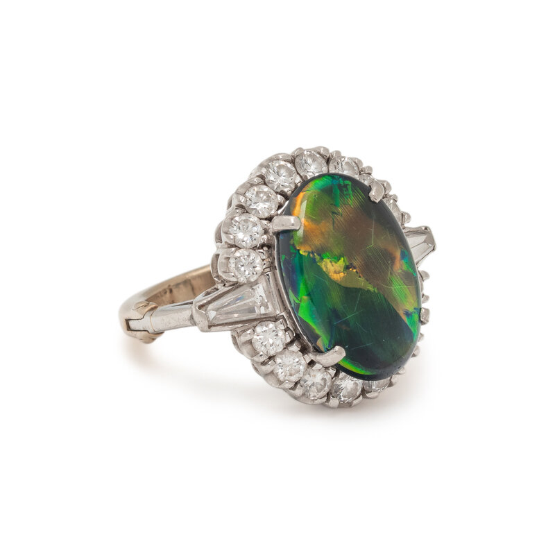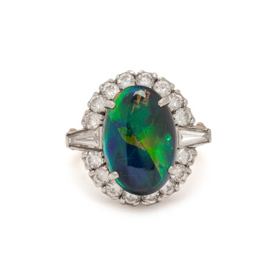 Oval cabochon black opal measuring approximately 14.45 x 9.75 x 4.00 mm, and round and baguette cut diamonds weighing approximately 1.00 carat total. White gold and platinum. Ring size 4.