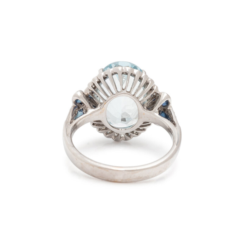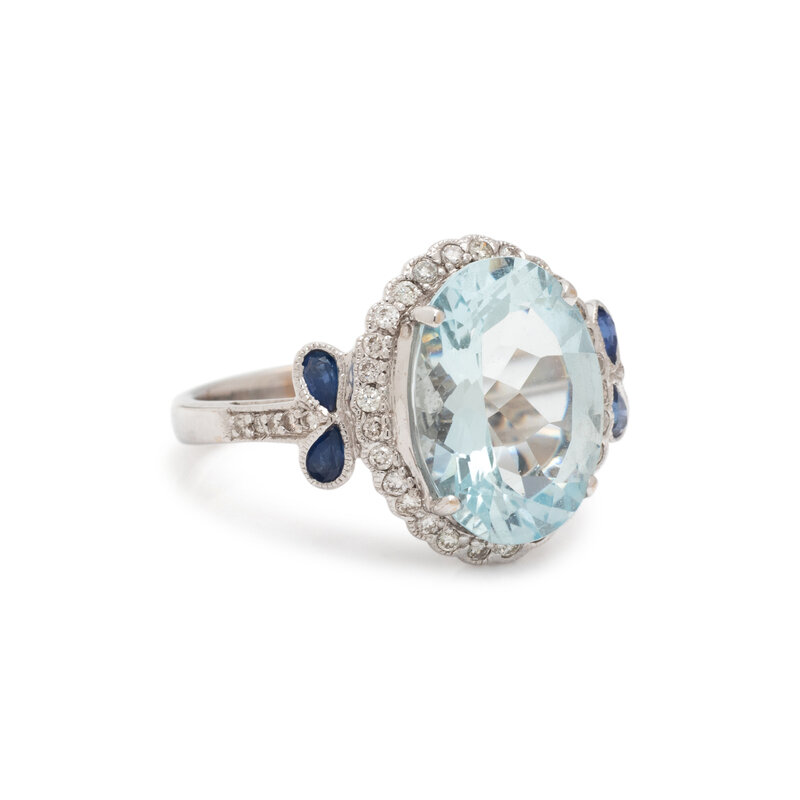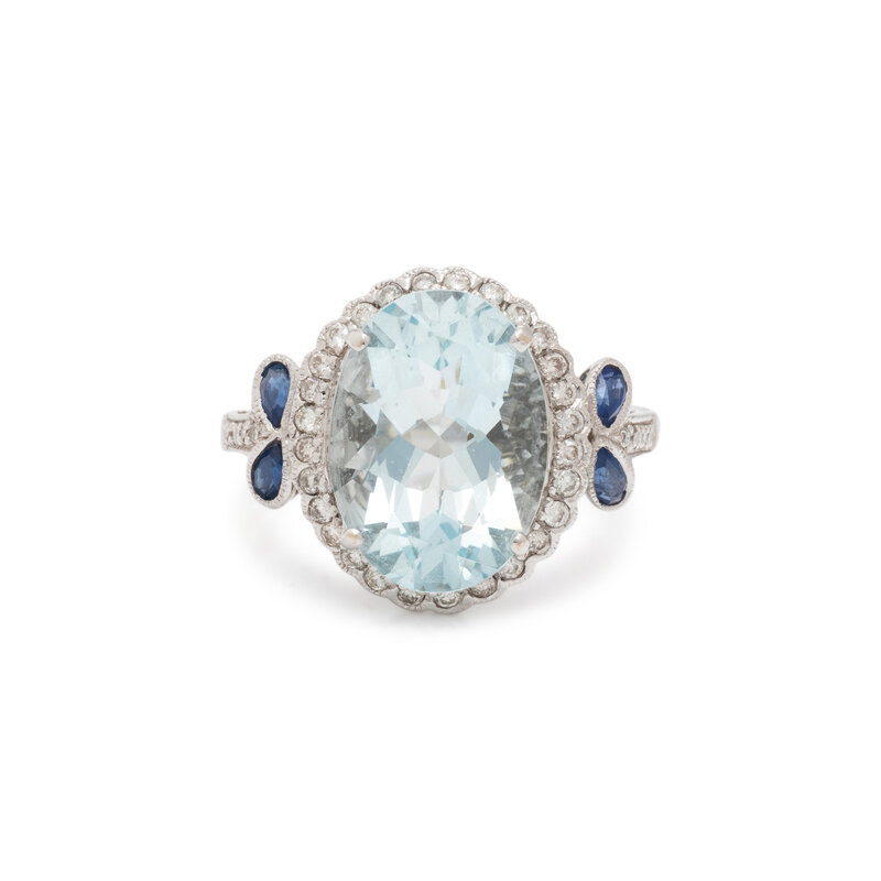 Oval aquamarine measuring approximately 13.80 x 10.10 x 6.10 mm, with pear shaped sapphires and round diamond accents. 18 karat white gold. Ring size 7.