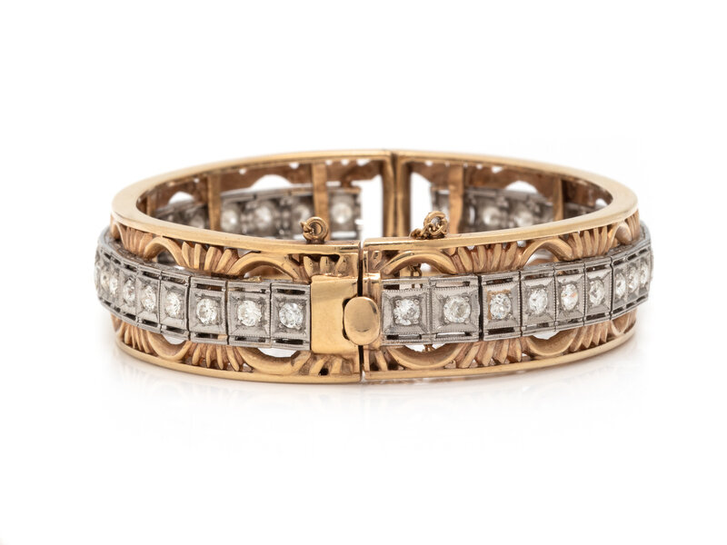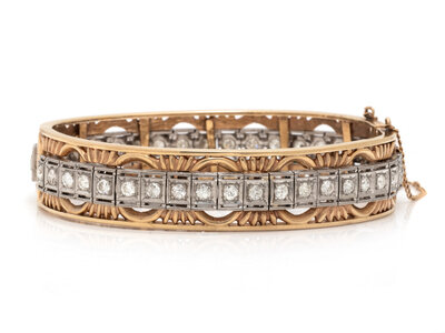 Old European and transitional cut diamonds weighing approximately 2.40 carats total, hinged with side clasp. 14 karat yellow and white gold. 7 inches inner circumference, 9/16 inch wide.