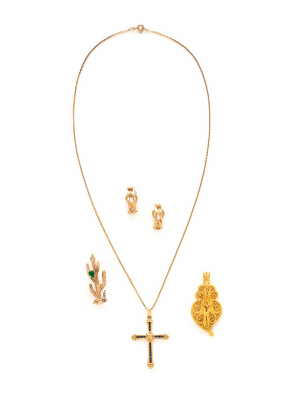 Including a pair of earrings, a cactus brooch, a cross pendant necklace, and an openwork pendant. Yellow gold. Earrings: 13/16 inch long. Cactus brooch: 1 1/4 x 1/2 inch. Chain: 18 inches long. Cross pendant: 1 1/2 inches long. Pendant: 1 5/8 inches long.