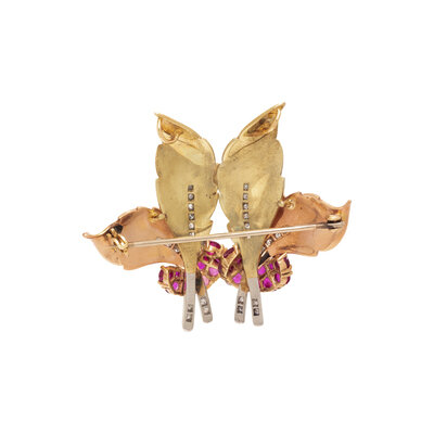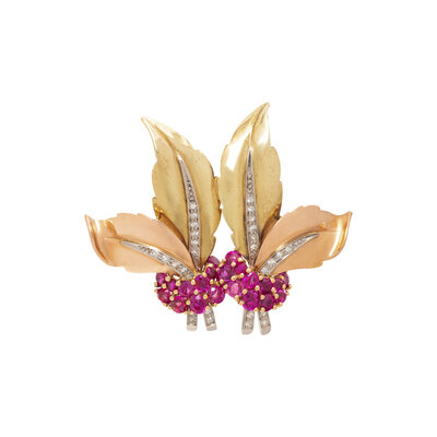 TRICOLOR GOLD, RUBY, AND DIAMOND BROOCH