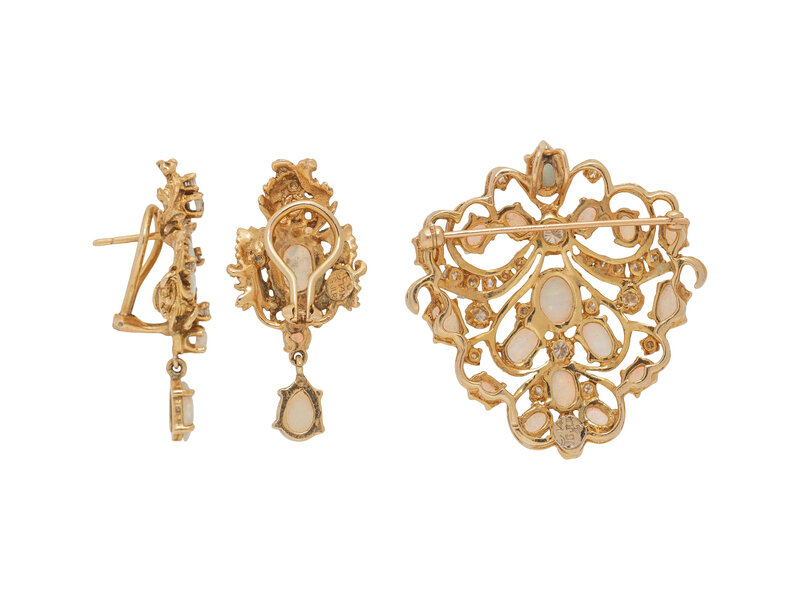 Opal cabochons and round diamonds. 14 karat yellow gold. Pendant/Brooch: 1 1/2 x 1 5/8 inches. Earrings: 1 1/2 inches long.