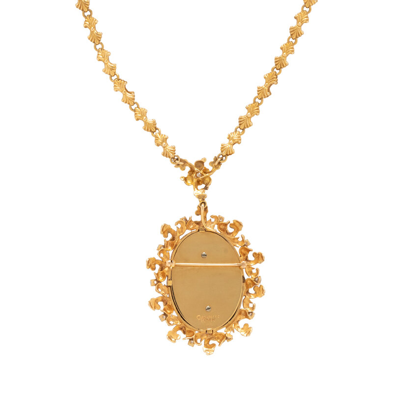 Round and single cut diamonds, and black felt. 14 karat yellow gold. Pendant/Brooch: 2 x 1 5/8 inches. Chain: 18 1/2 inches long.