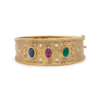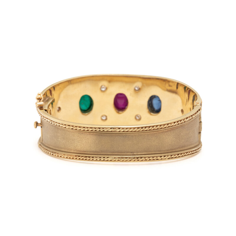 BRUSHED YELLOW GOLD, RUBY, EMERALD, SAPPHIRE, AND DIAMOND BANGLE BRACELET