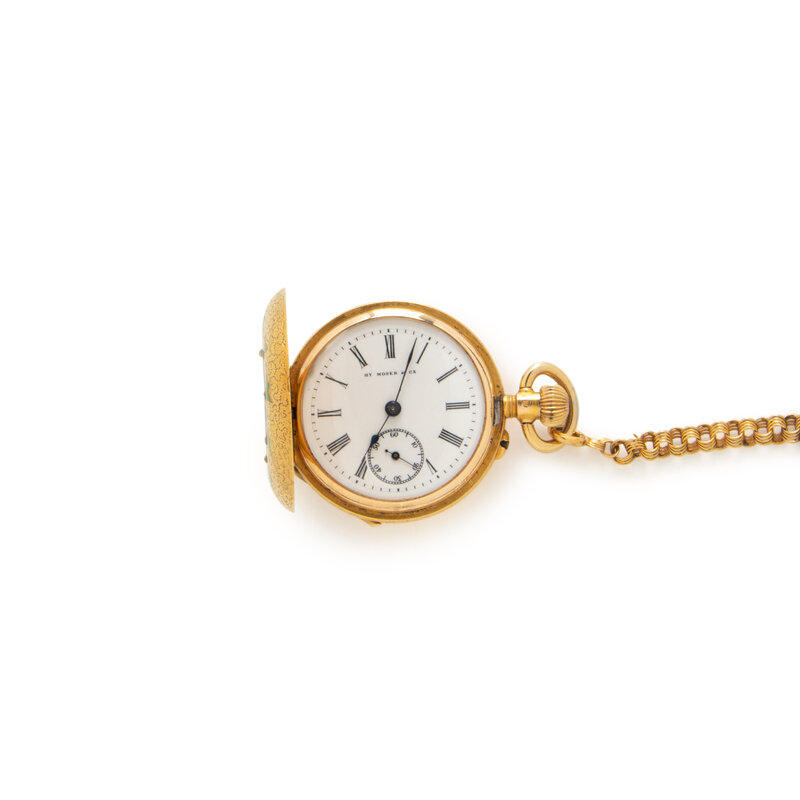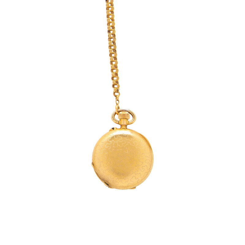 YELLOW GOLD, ENAMEL AND DIAMOND POCKET WATCH AND FOB CHAIN
