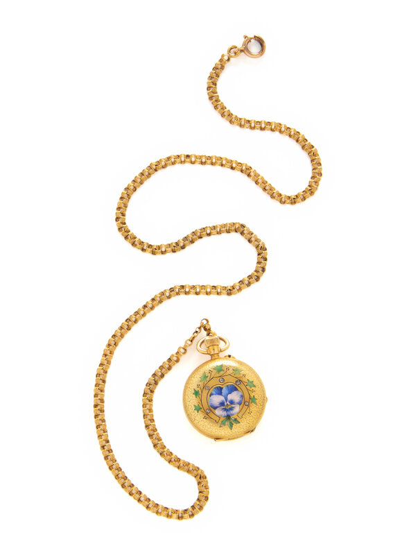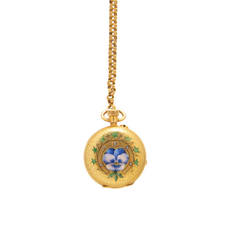 Case material: 14 karat yellow gold, polychrome enamel, and rose cut diamonds