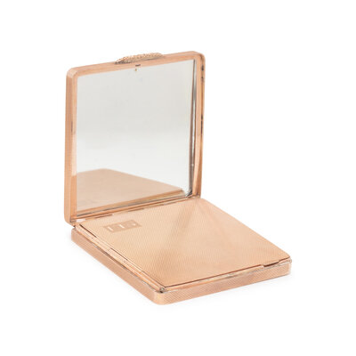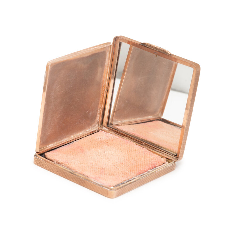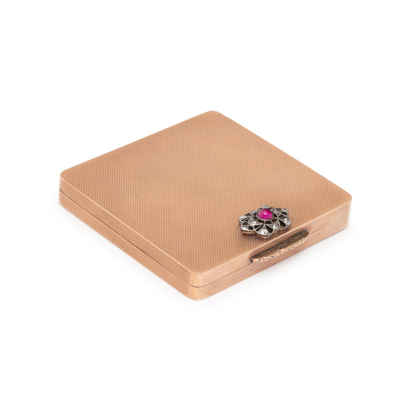 LOW KARAT GOLD, SYNTHETIC RUBY, AND DIAMOND COMPACT