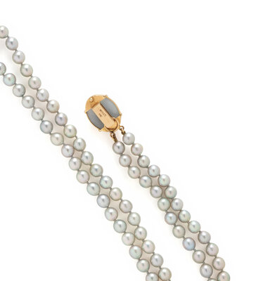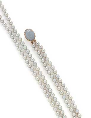 Cultured gray pearls (origin of color not tested) measuring approximately 6.00 - 6.50 mm, and carved oval lavender jade measuring approximately 19.85 x 15.30 mm. 14 karat yellow gold. 17 1/2 inches long.