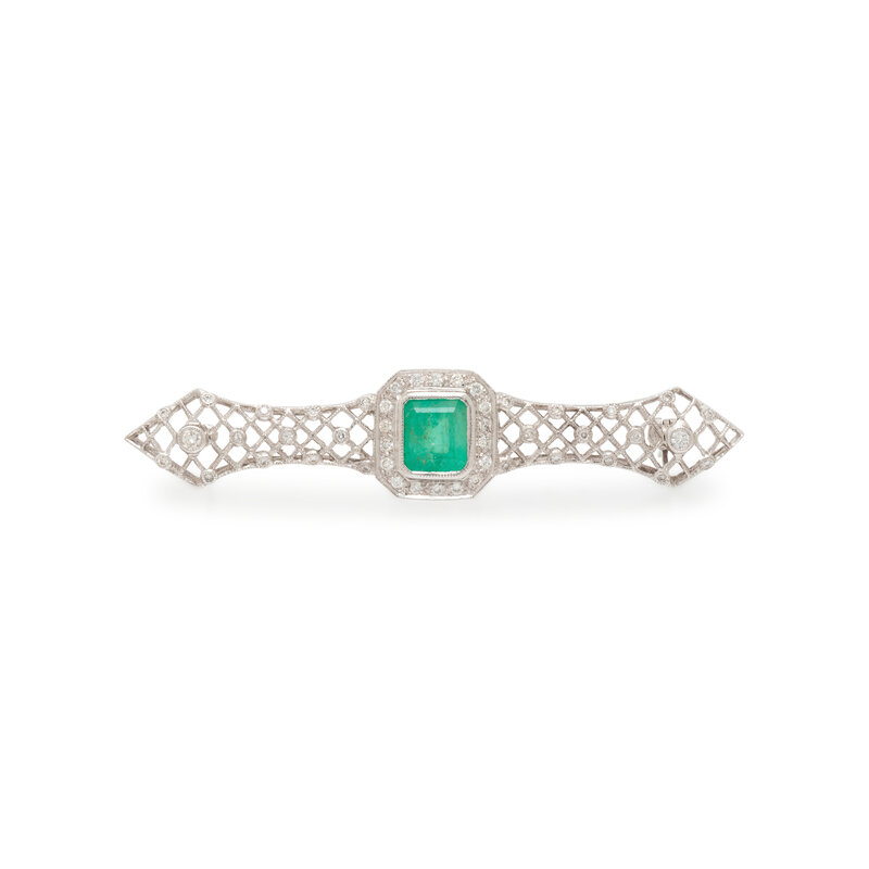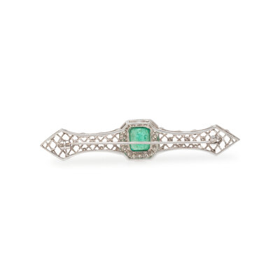Emerald cut emerald weighing approximately 1.80 carats by formula, and round diamonds. 18 karat white gold. 2 5/8 inches long.
