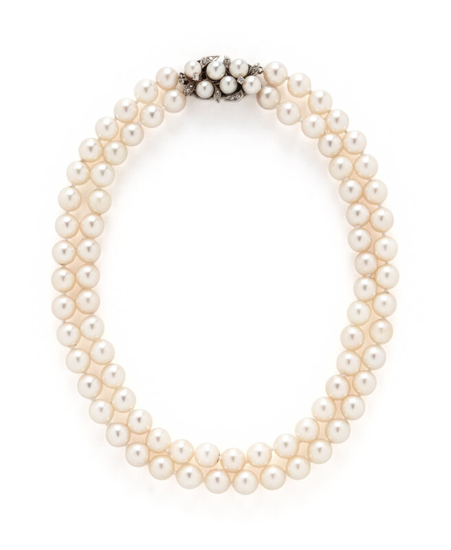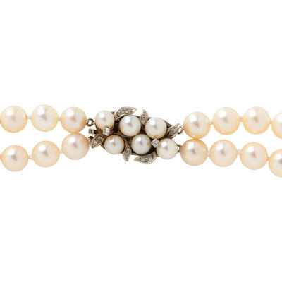 Two strands of cultured pearls measuring approximately 7.50 - 7.80 mm, with a 14 karat white gold clasp set with cultured pearls measuring approximately 5.40 - 6.00 mm and round and single cut diamonds. 13 1/2 inches long.
