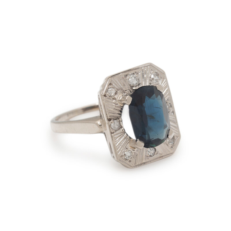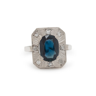 Oval sapphire weighing approximately 2.30 carats by formula and single cut diamonds weighing approximately 0.25 carat total. White gold. Ring size 8.
