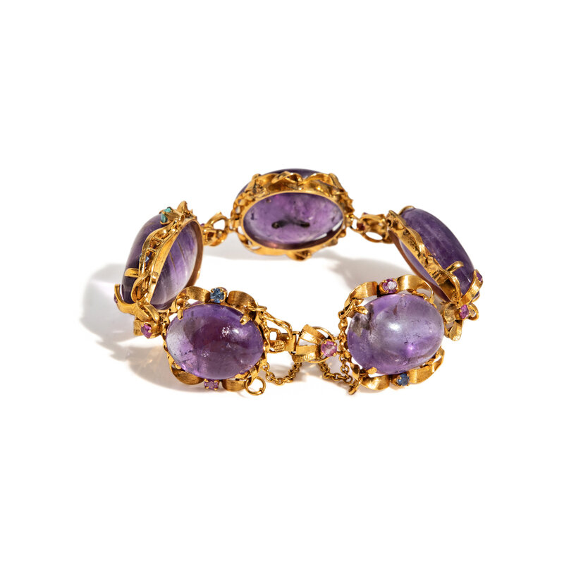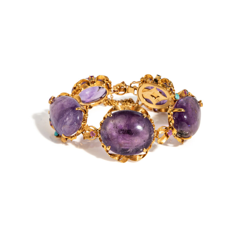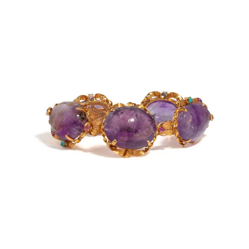 Oval and pear shaped cabochon amethyst, round faceted rubies and sapphires, and round cabochon turquoise. Yellow gold. 6 inches long.