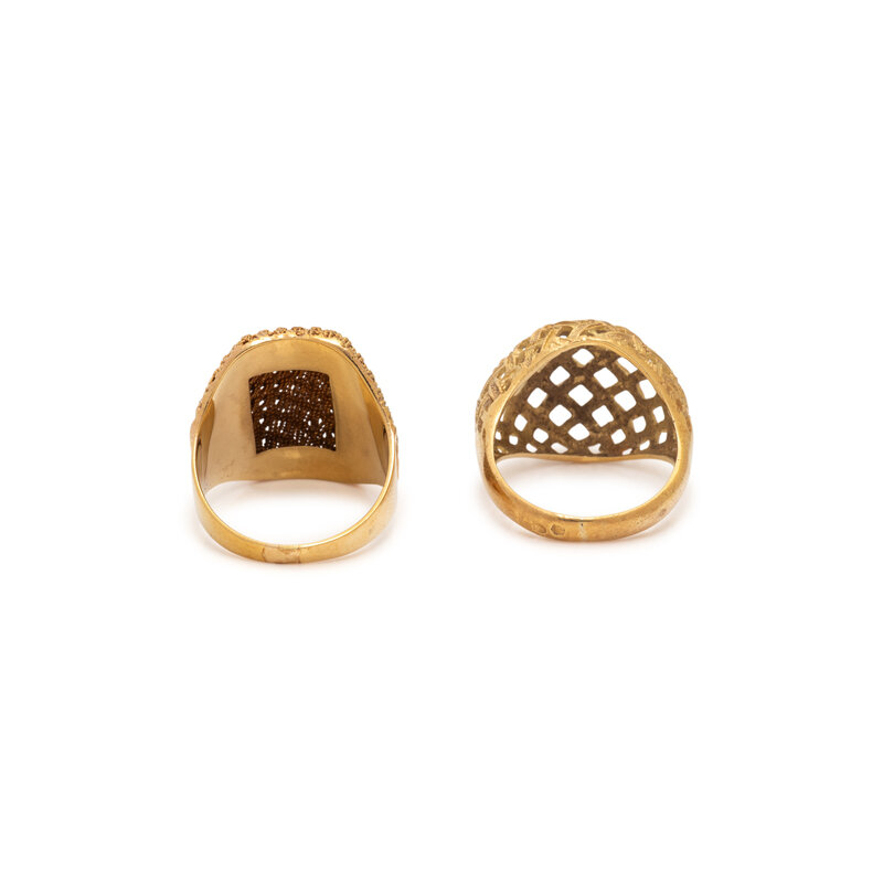 TWO YELLOW GOLD BASKETWEAVE RINGS