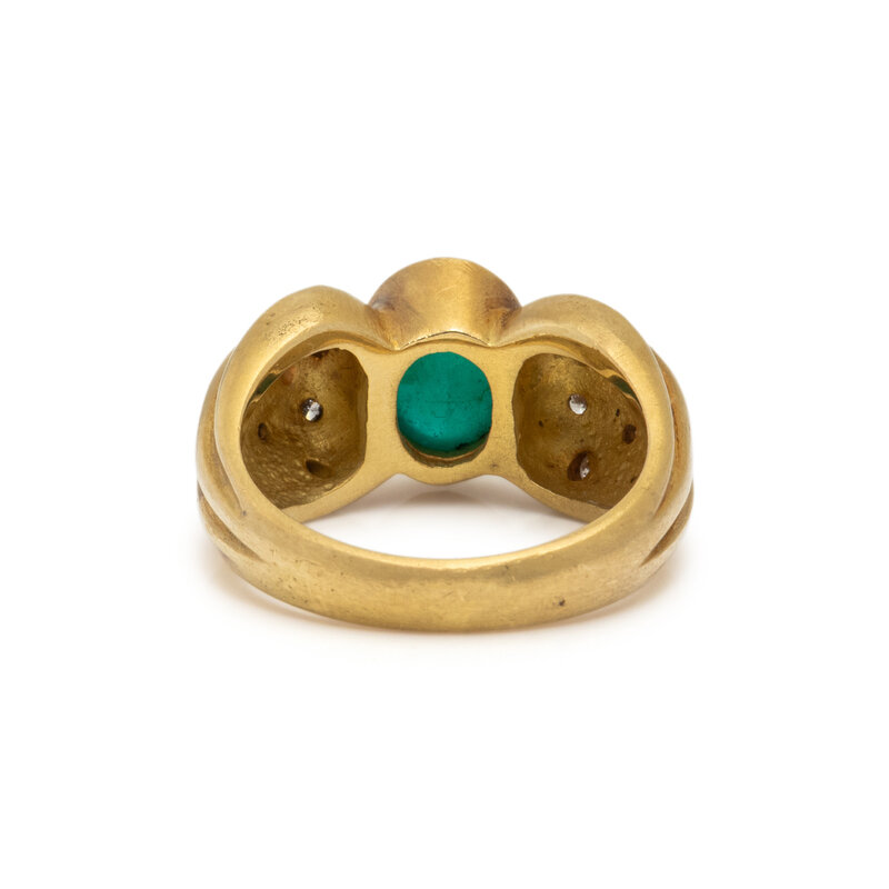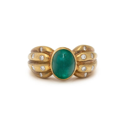 Oval cabochon emerald weighing approximately 2.50 carats by formula and round diamonds. 18 karat yellow gold. Ring size 6 3/4.
