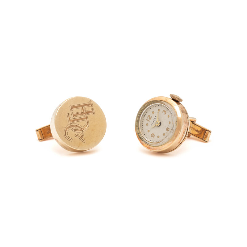 One cufflink monogrammed 'HDC', the other with a manual wind watch. 14 karat yellow gold. 11/16 inch wide.