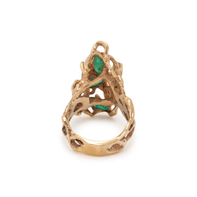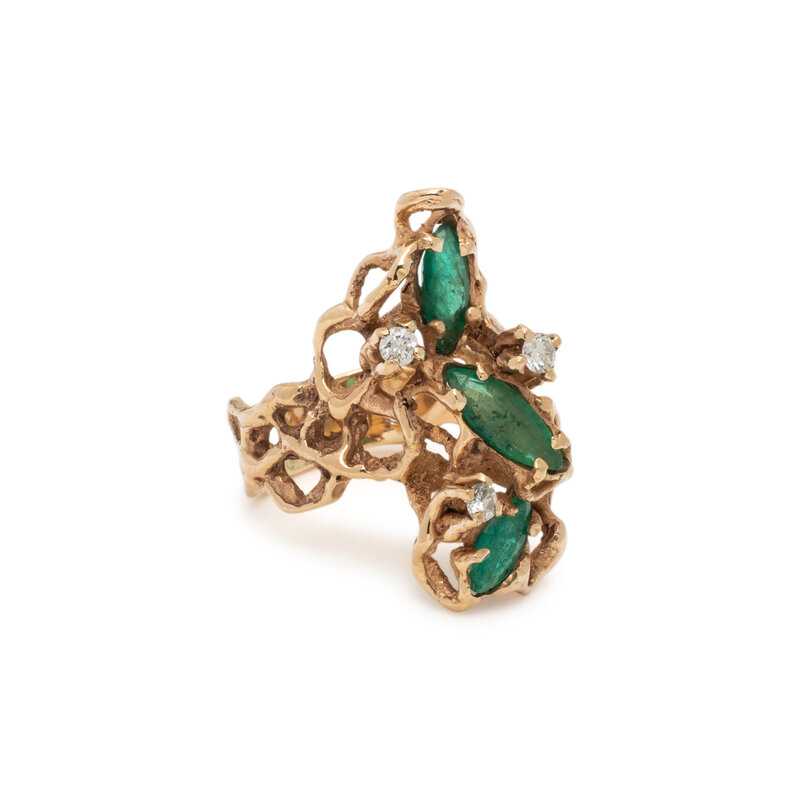 Marquise cut emeralds and round diamonds. Yellow gold. Ring size 8.