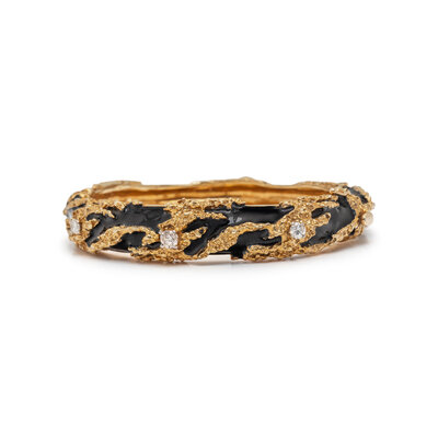 Black enamel and round diamonds weighing approximately 0.50 carat total, hinged with side clasp. 14 karat yellow gold. 6 inches inner circumference.