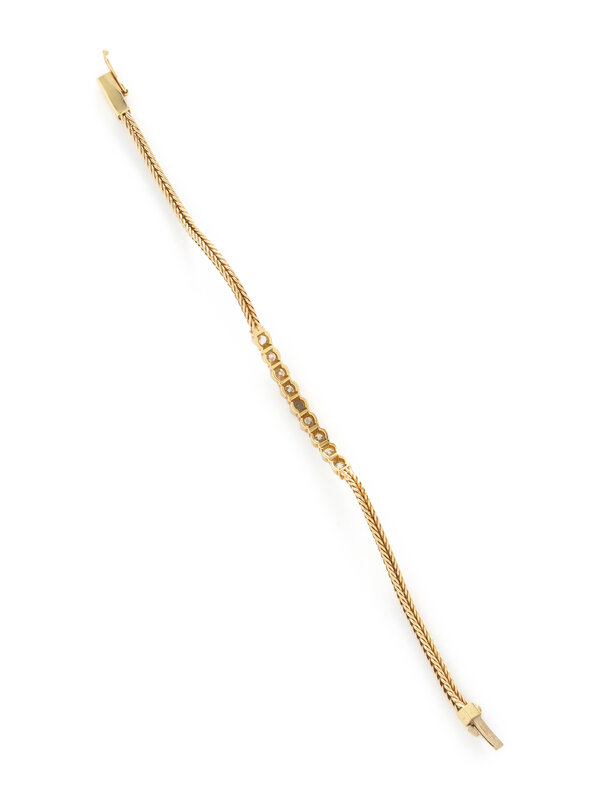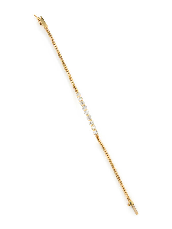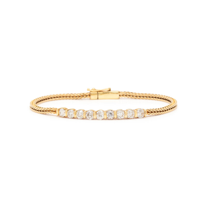 Round diamonds weighing approximately 1.80 carats total. 18 karat yellow gold. 6 inches long.