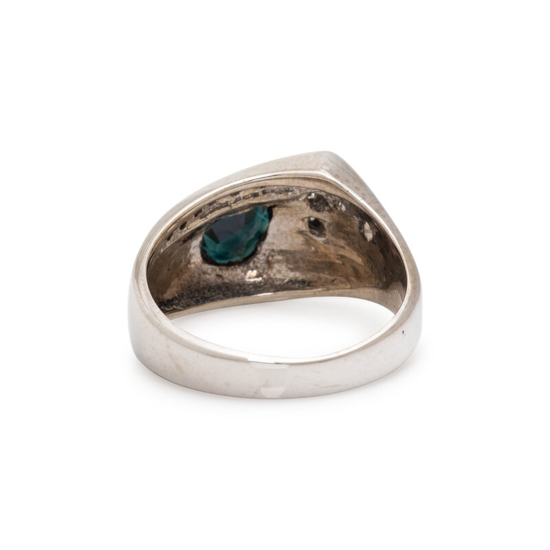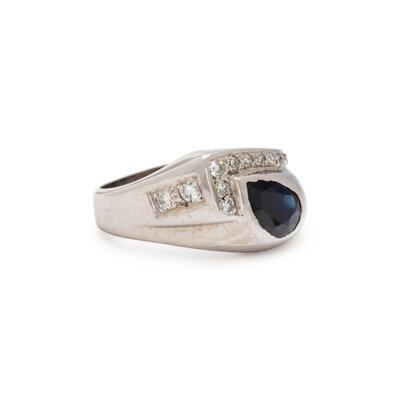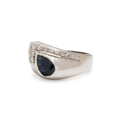 Pear shaped sapphire weighing approximately 0.75 carat by formula, and round and single cut diamonds. 14 karat white gold. Ring size 8.