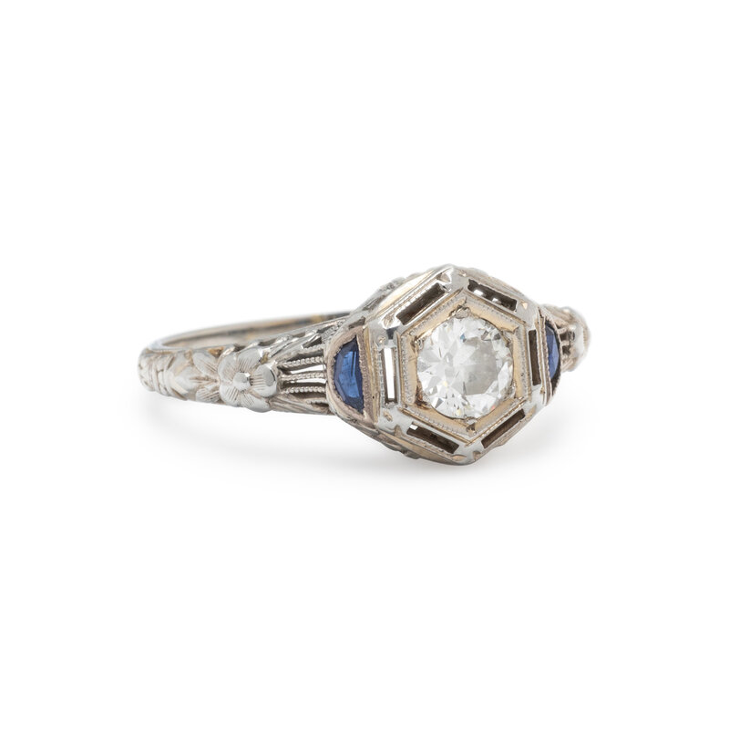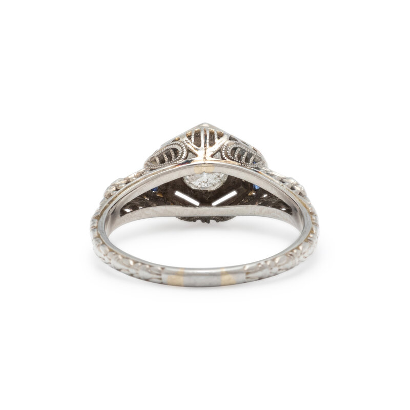 Transitional cut diamond weighing approximately 0.40 carat and synthetic sapphire accents. 18 karat white gold. Ring size 6 1/2.