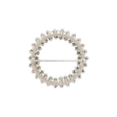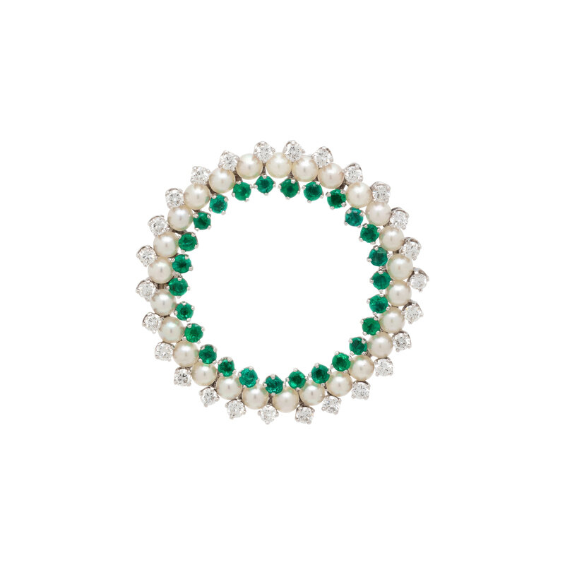 DIAMOND, CULTURED PEARL, AND EMERALD BROOCH
