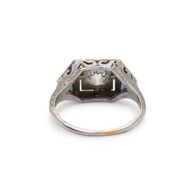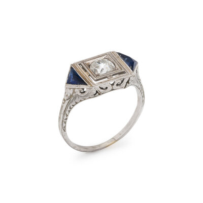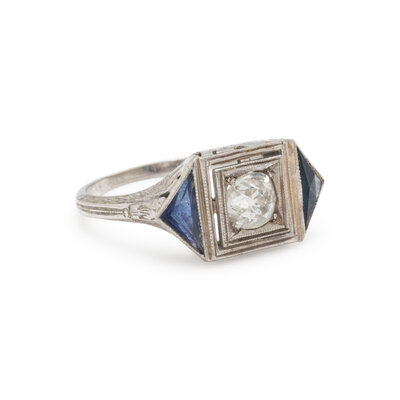 Old European cut diamond weighing approximately 0.45 carat and triangular synthetic sapphire accents. 18 karat white gold. Ring size 6 1/4.