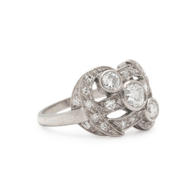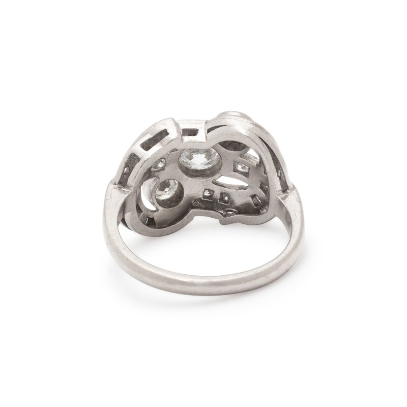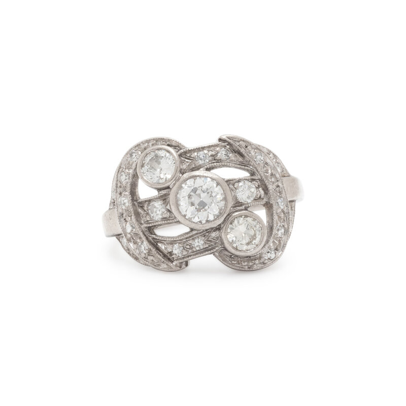 Three old European and transitional cut diamonds weighing approximately 0.70 carat total, with round and single cut diamond accents. Platinum. Ring size 6.