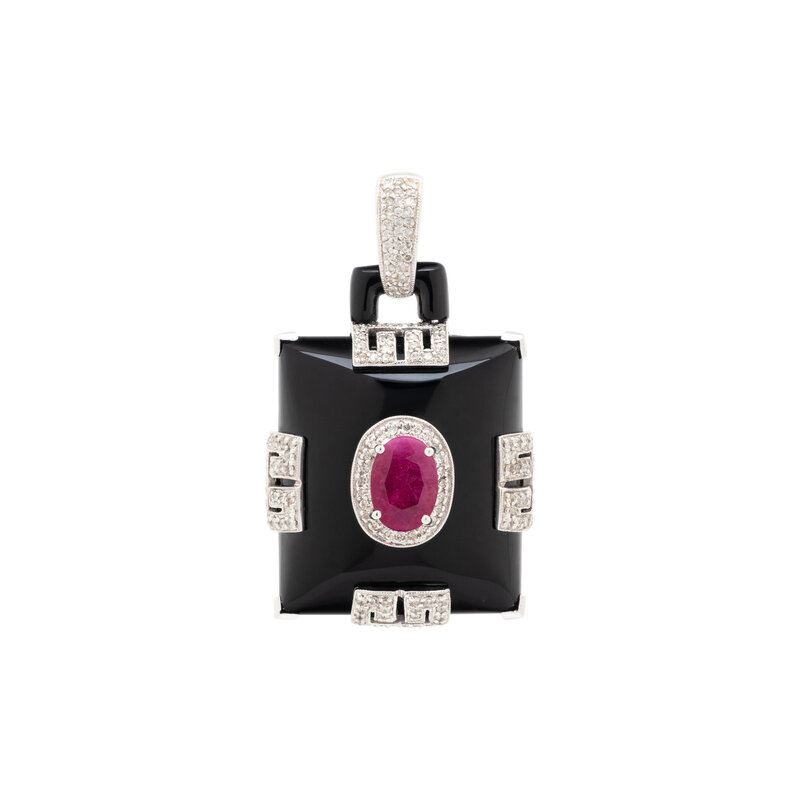 BLACK ONYX, RUBY, AND DIAMOND PENDANT