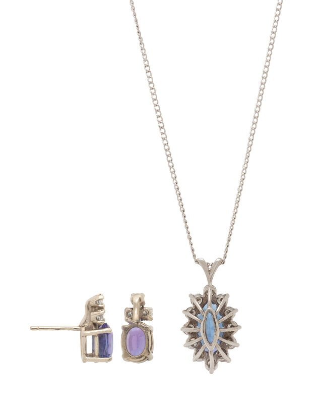 Marquise and oval tanzanite, and round diamonds weighing approximately 1.00 carat total. White gold. Earrings: 1/2 inch long. Chain: 18 inches long. Pendant: 3/4 inch long.
