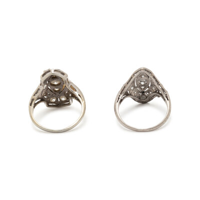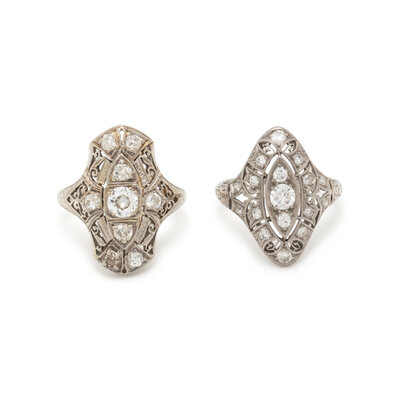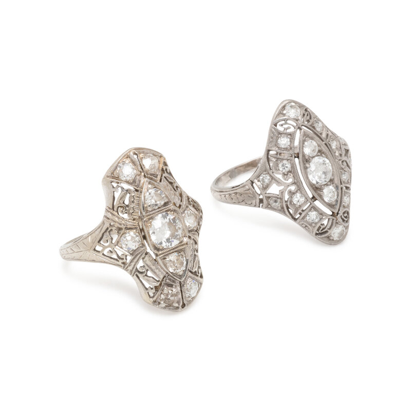 One set with an old European cut diamond weighing approximately 0.30 carats with old mine and single cut diamond accents weighing approximately 0.45 carat total, the other set with old European, transitional, and single cut diamonds weighing approximately 0.50 carat total. 18 karat white gold and platinum. Ring sizes 4 and 4 1/2.
