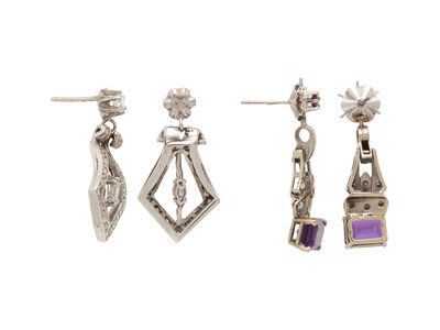 Including a pair of earrings set with round and marquise cut diamonds weighing approximately 1.00 carat total, and a pair of earrings set with emerald cut amethysts measuring approximately 8.00 x 6.00 mm, round red gemstones, and round diamonds. 1 1/8 and 1 1/4 inches long.