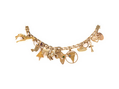 Thirteen charms total. 14 karat yellow gold with low karat gold, yellow gold, and other charms. 7 1/4 inches long.