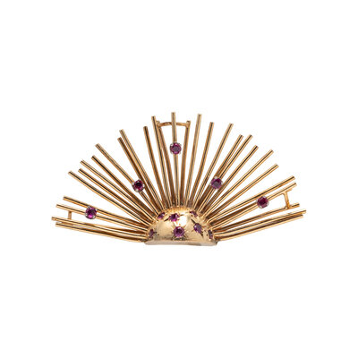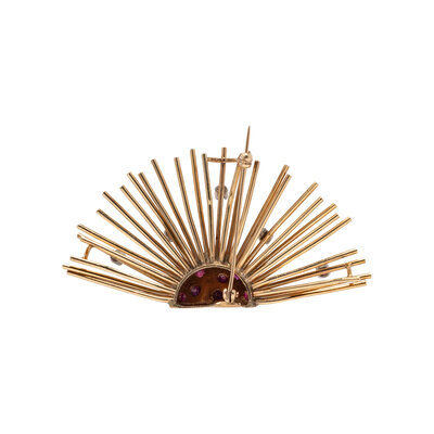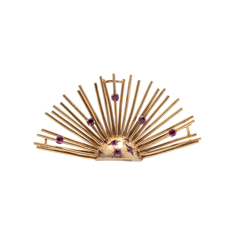 RETRO, RUBY AND YELLOW GOLD SUNBURST BROOCH