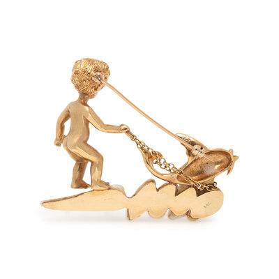 Freshwater cultured pearls, round sapphire eyes, and a round ruby eye. 14 karat yellow gold. 1 1/2 x 2 inch.