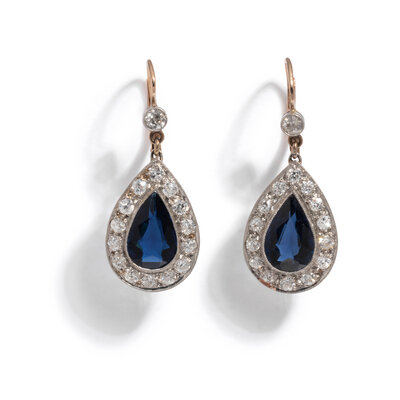 Pear shaped dark blue glass, and old European cut diamonds weighing approximately 1.70 carats total. Platinum with yellow gold wires. 1 1/4 inches long.