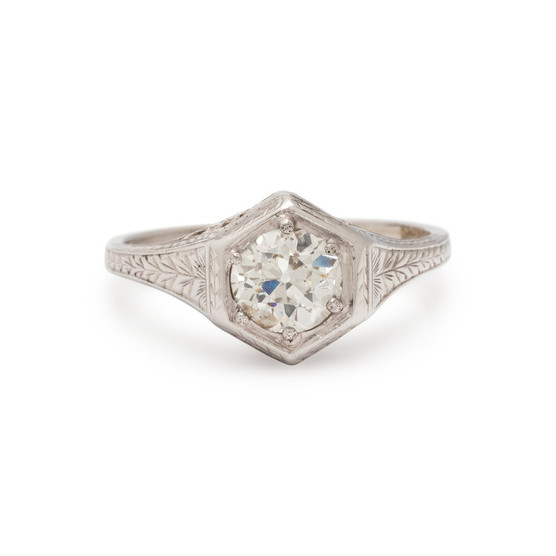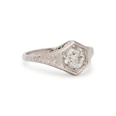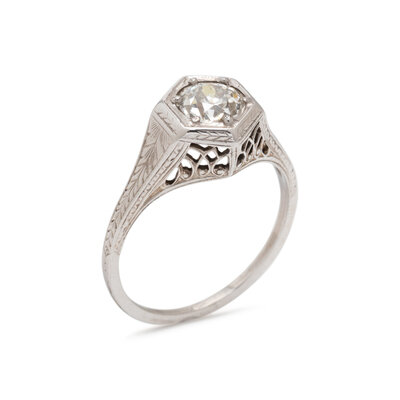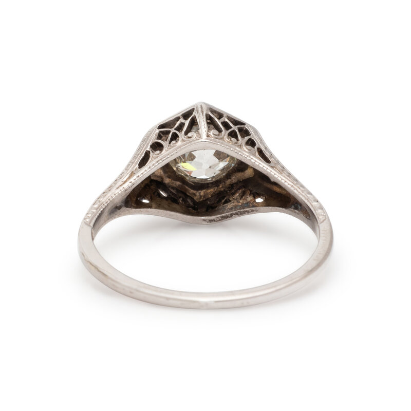 Old European cut diamond weighing approximately 0.80 carat. 18 karat white gold. Ring size 6 3/4.