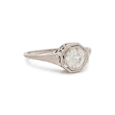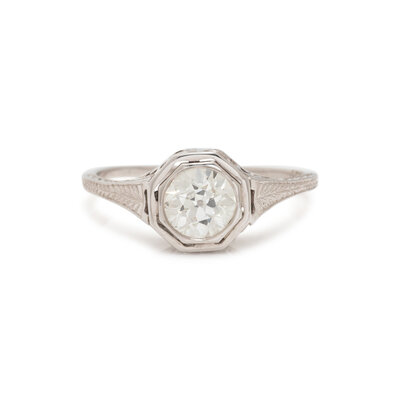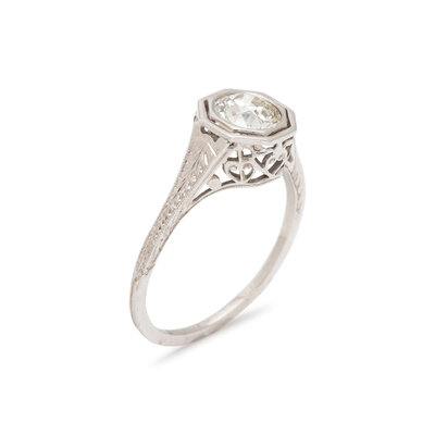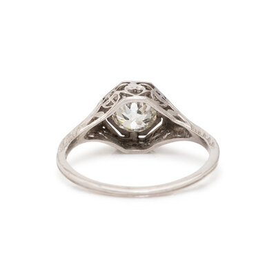 Old European cut diamond weighing approximately 0.80 carat total. Platinum. Ring size 7.