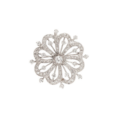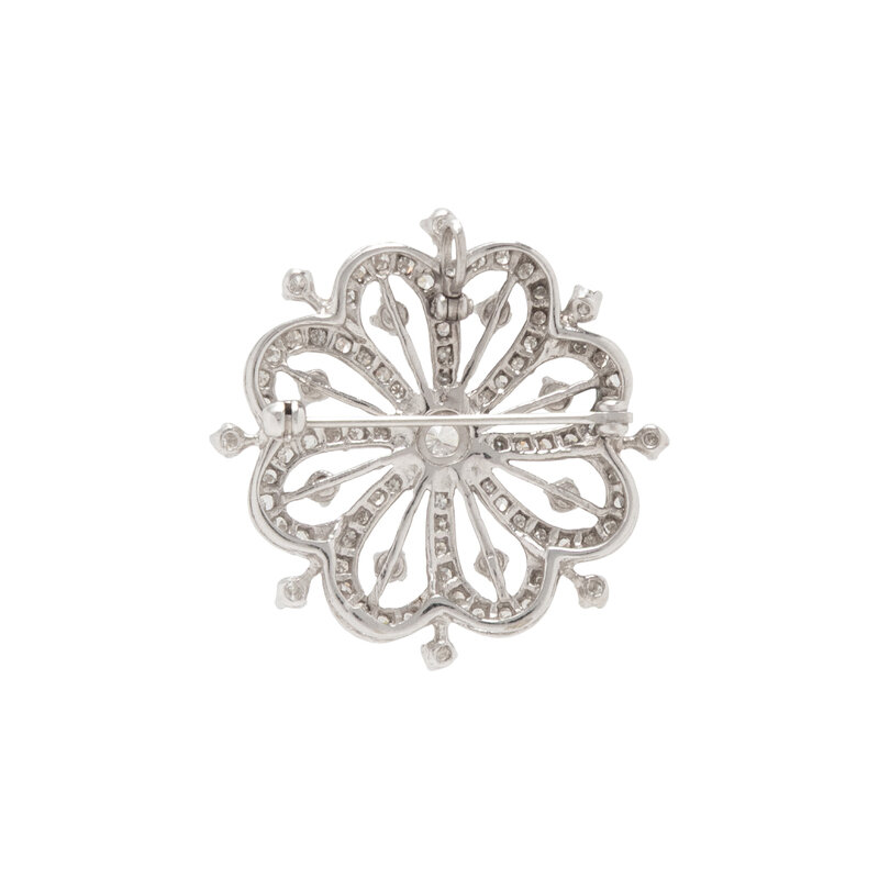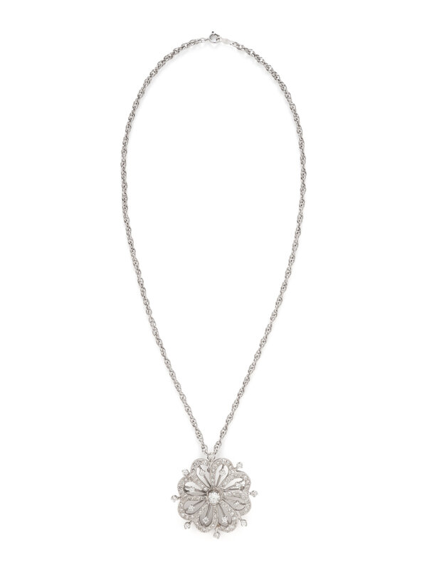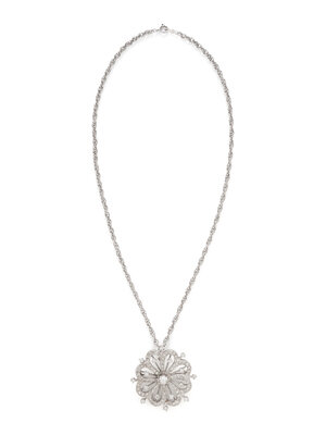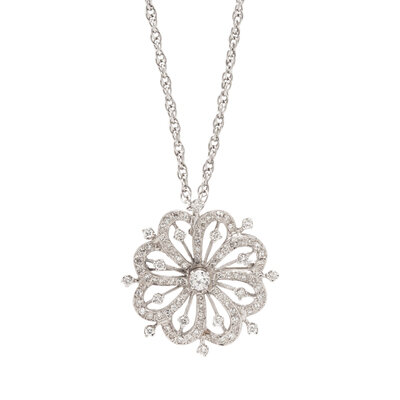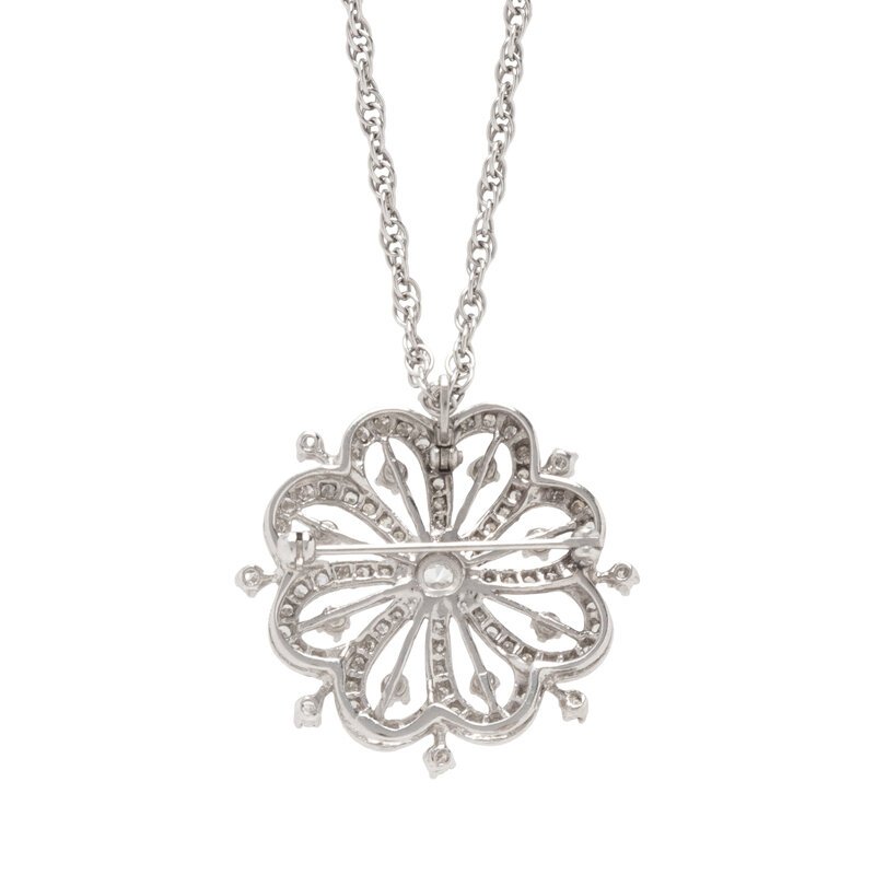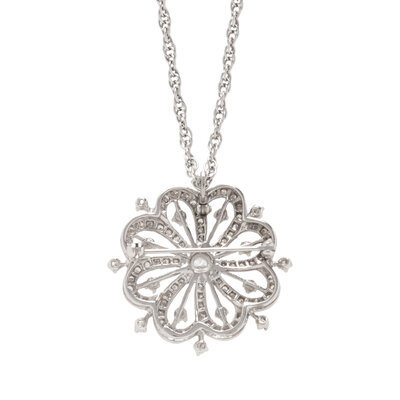 Round and single cut diamonds weighing approximately 1.70 carats total. 14 karat white gold. Chain: 14 3/4 inches long. Pendant: 1 1/4 inches wide.