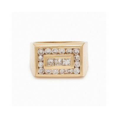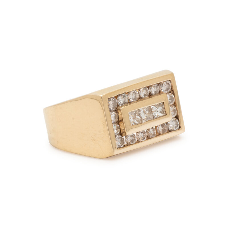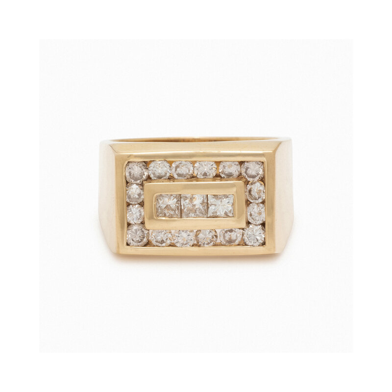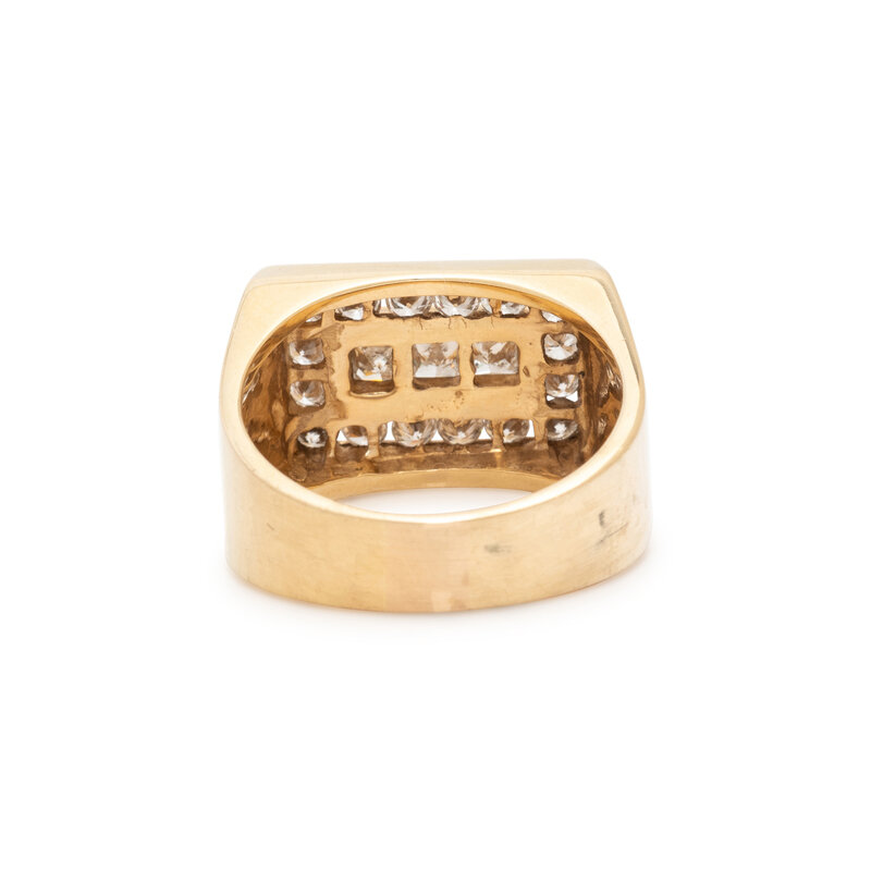 Round and princess cut diamonds weighing approximately 1.80 carats total. 14 karat yellow gold. Ring size 12.