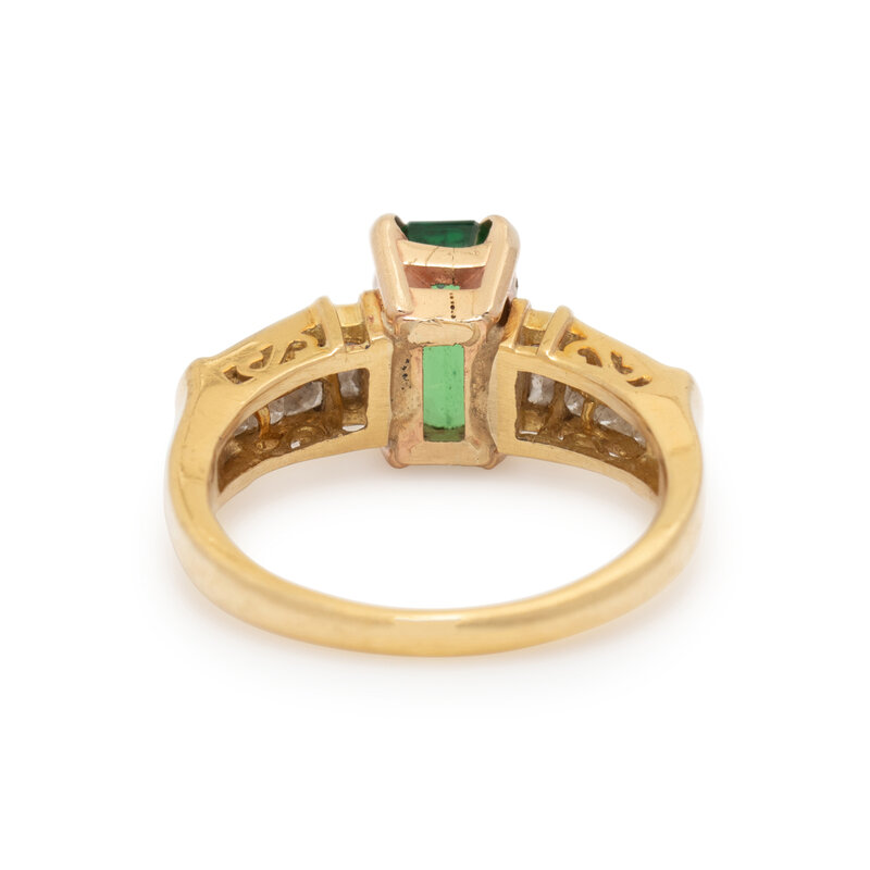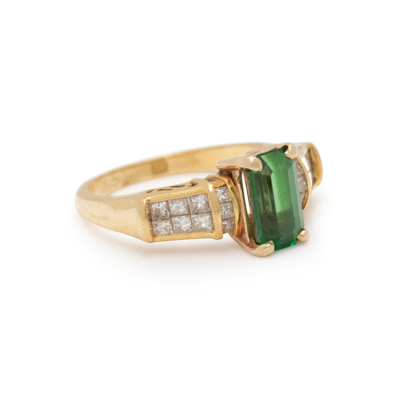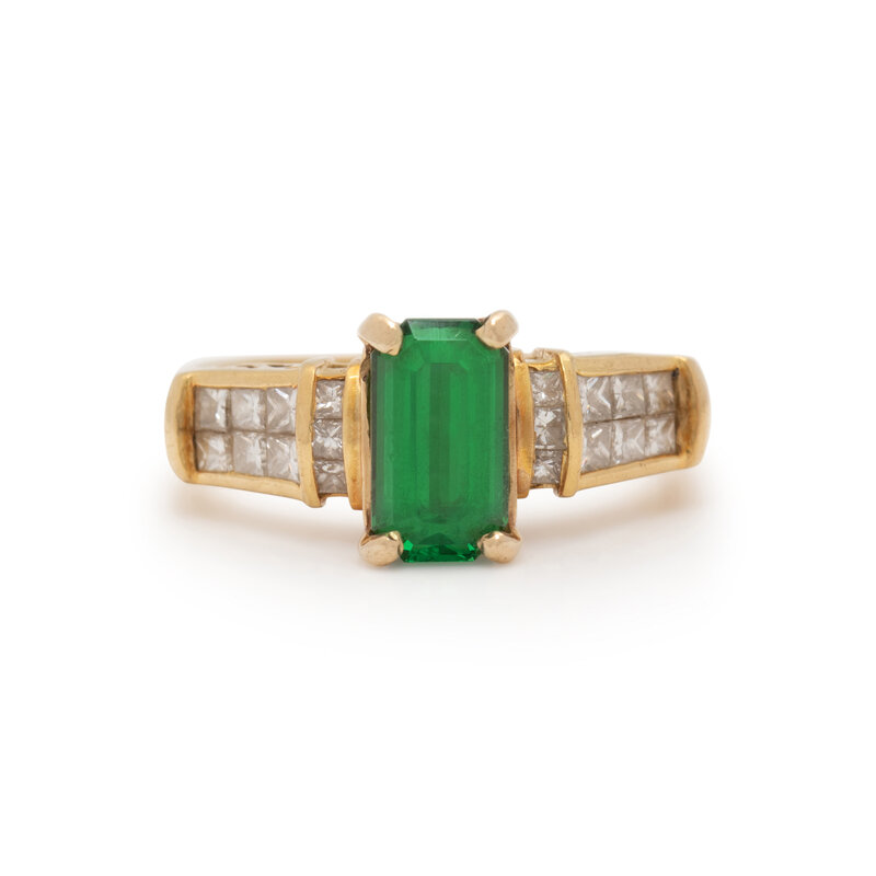 Emerald cut green tsavorite garnet weighing approximately 1.80 carats by formula, and princess cut diamonds weighing approximately 0.70 carat total. Yellow gold. Ring size 7 1/2.