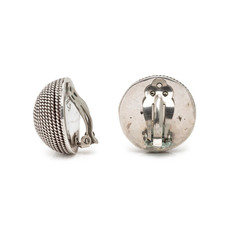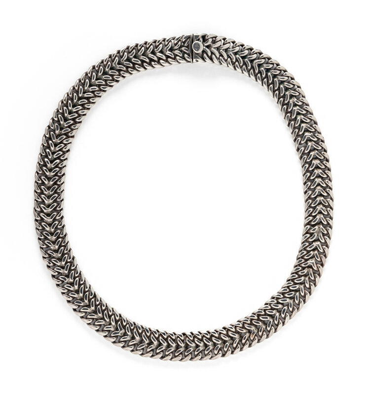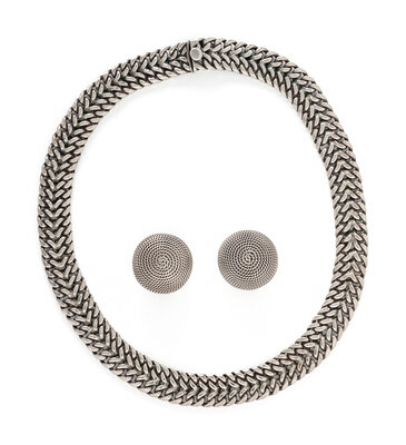 Comprising a necklace and earrings. Sterling silver. Earrings: 1 inch long. Necklace: 16 inches long.