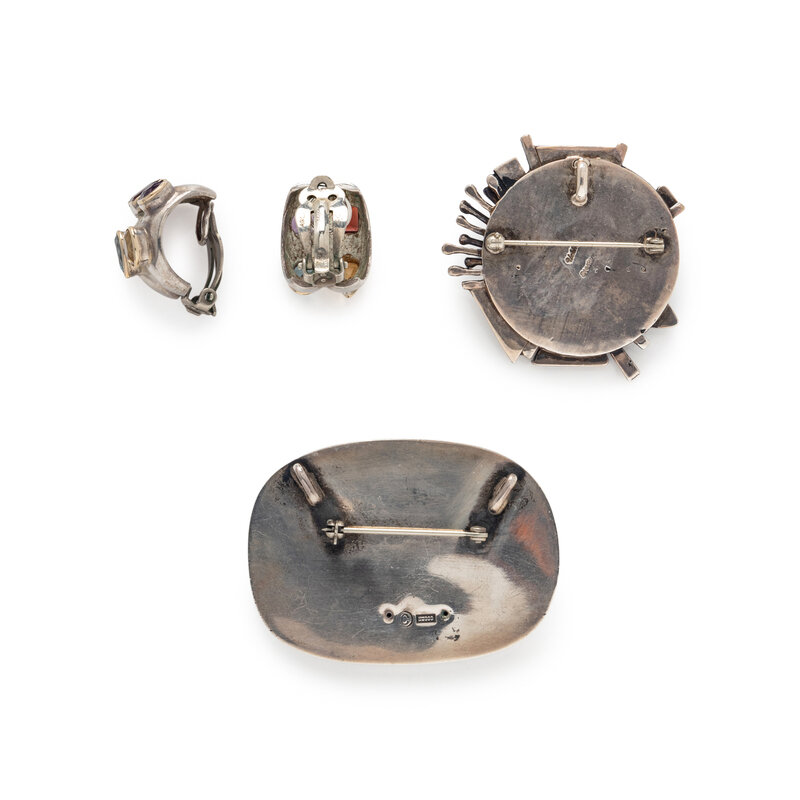 Comprising a floral motif brooch/pendant, a brooch/pendant set with variously shaped black onyx, malachite, hematite, amethyst, and cultured pearl, and a pair of earrings set with variously shaped garnet, amethyst, aquamarine, and citrine set in yellow gold bezels. Sterling silver and 14 karat yellow gold. Floral brooch: 2 1/4 x 1 5/8 inches. Gem-set brooch: 2 x 1 3/4 inches. Earrings: 7/8 inch long.